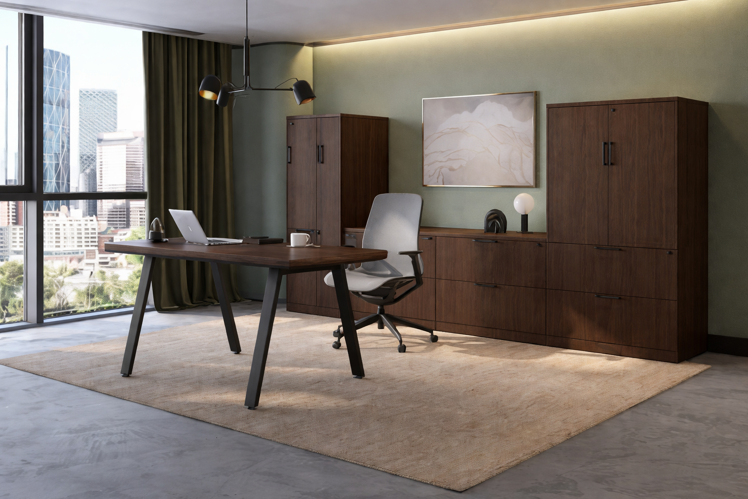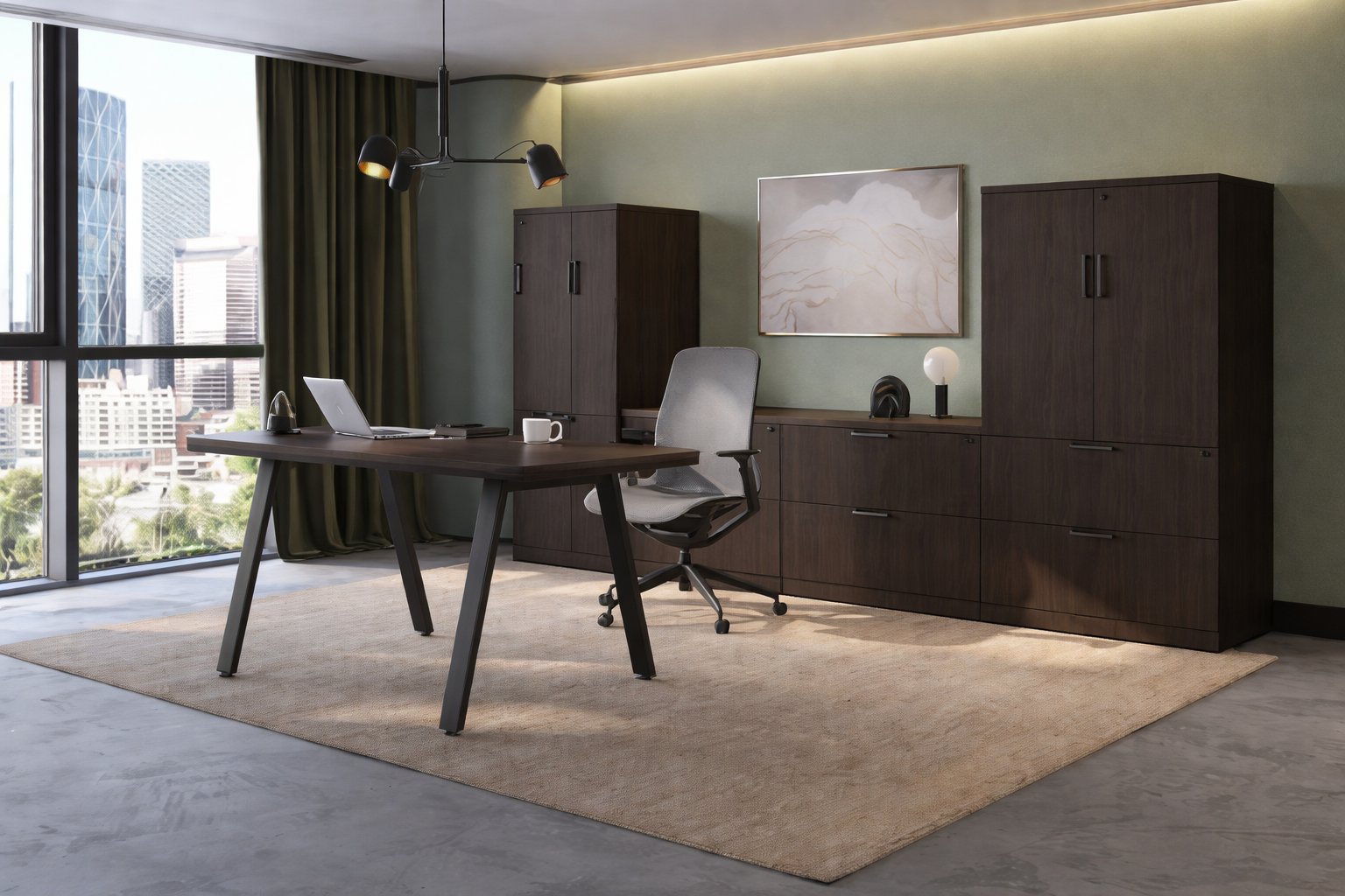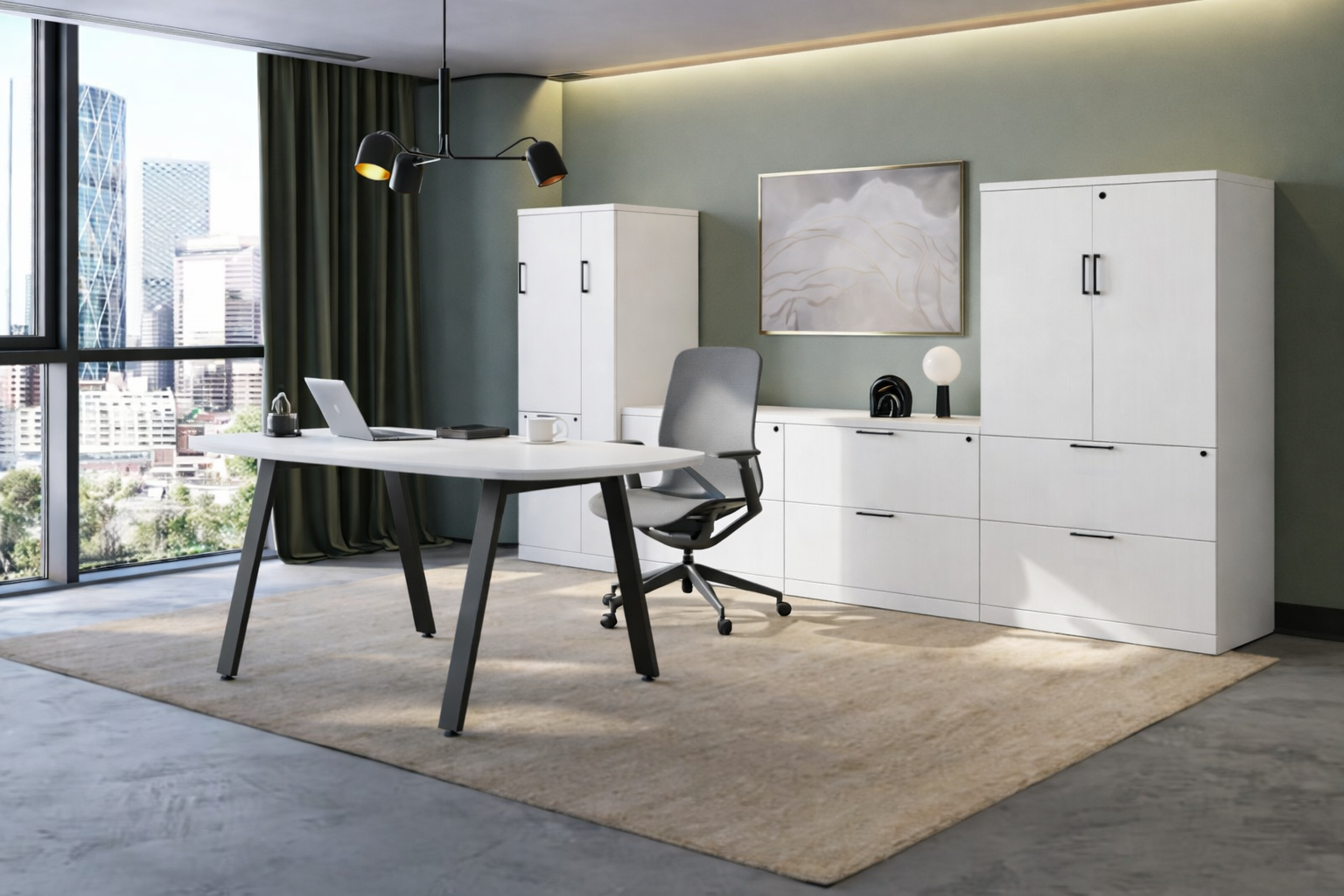 This arena shape desk measures 72″W x 36″D and comes in the Silver Birch Laminate color. The desk comes with metal V-Legs and features a large storage credenza featuring 3 two drawer lateral files, a wardrobe cabinet, and a storage cabinet. This desk is completely configurable to any specifications. Click Here to view our complete catalog of office furniture products.