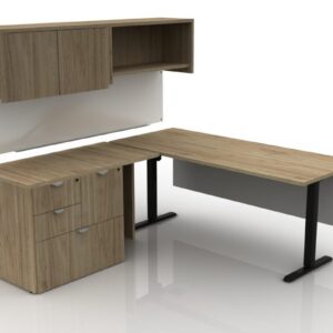 This fully laminated enclosed executive-height adjustable desk comes with a storage credenza and a hutch featuring glass doors.